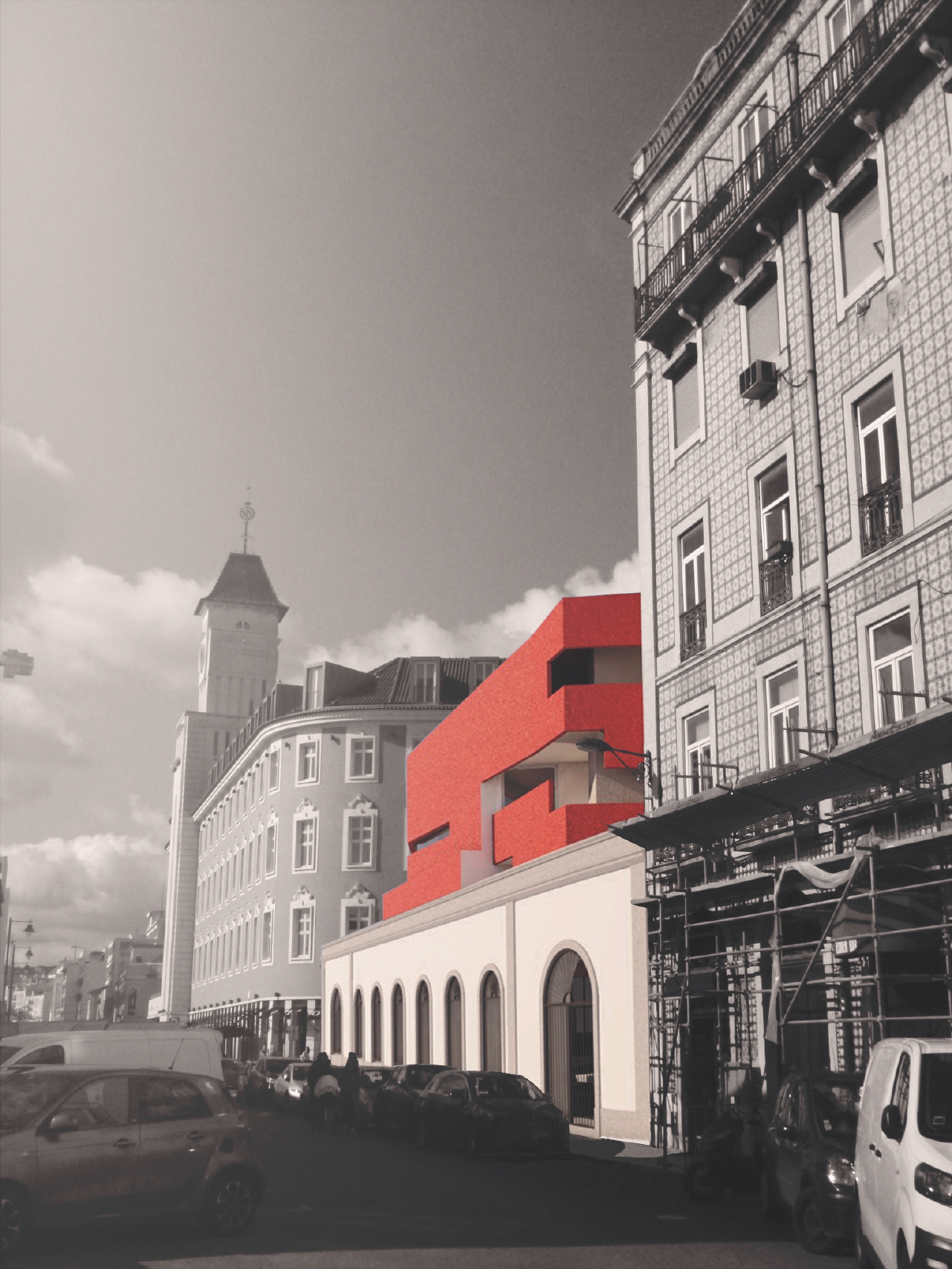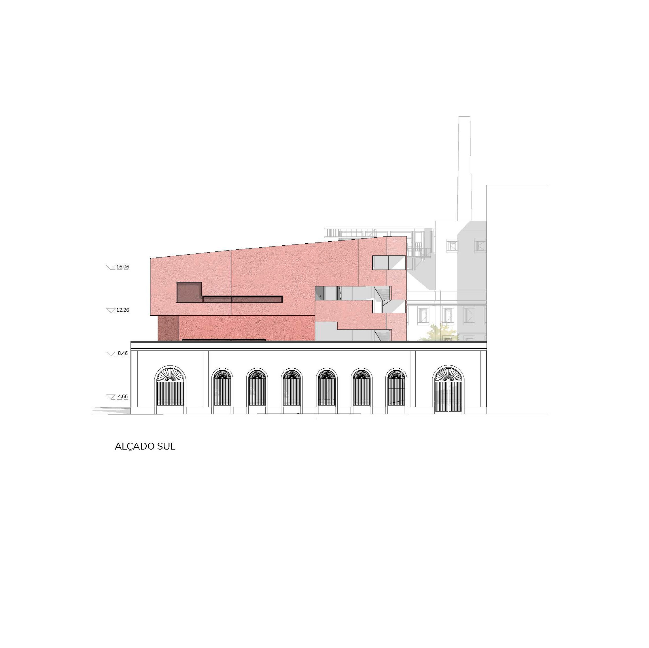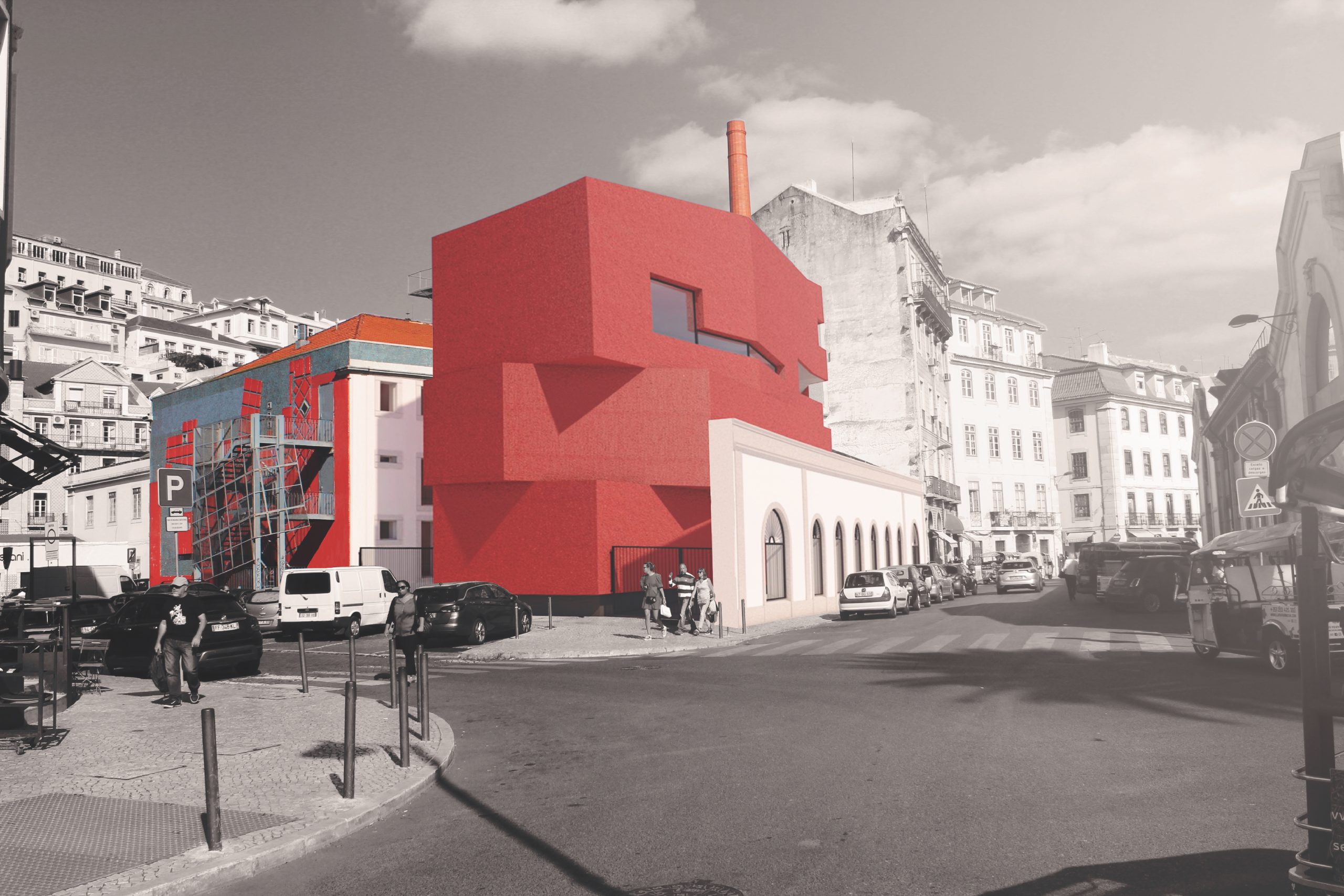 A escala vertical do edifício proposto, volume fragmentado piso a piso, dialoga com a massa horizontal da sede e dá continuidade visual à empena ao mesmo tempo que revela espaços estreitos ao modo do tecido espontâneo da Lisboa medieval em que se passa por becos e travessas.