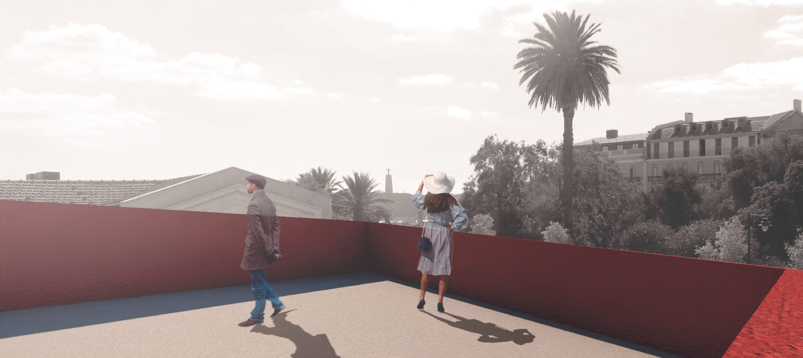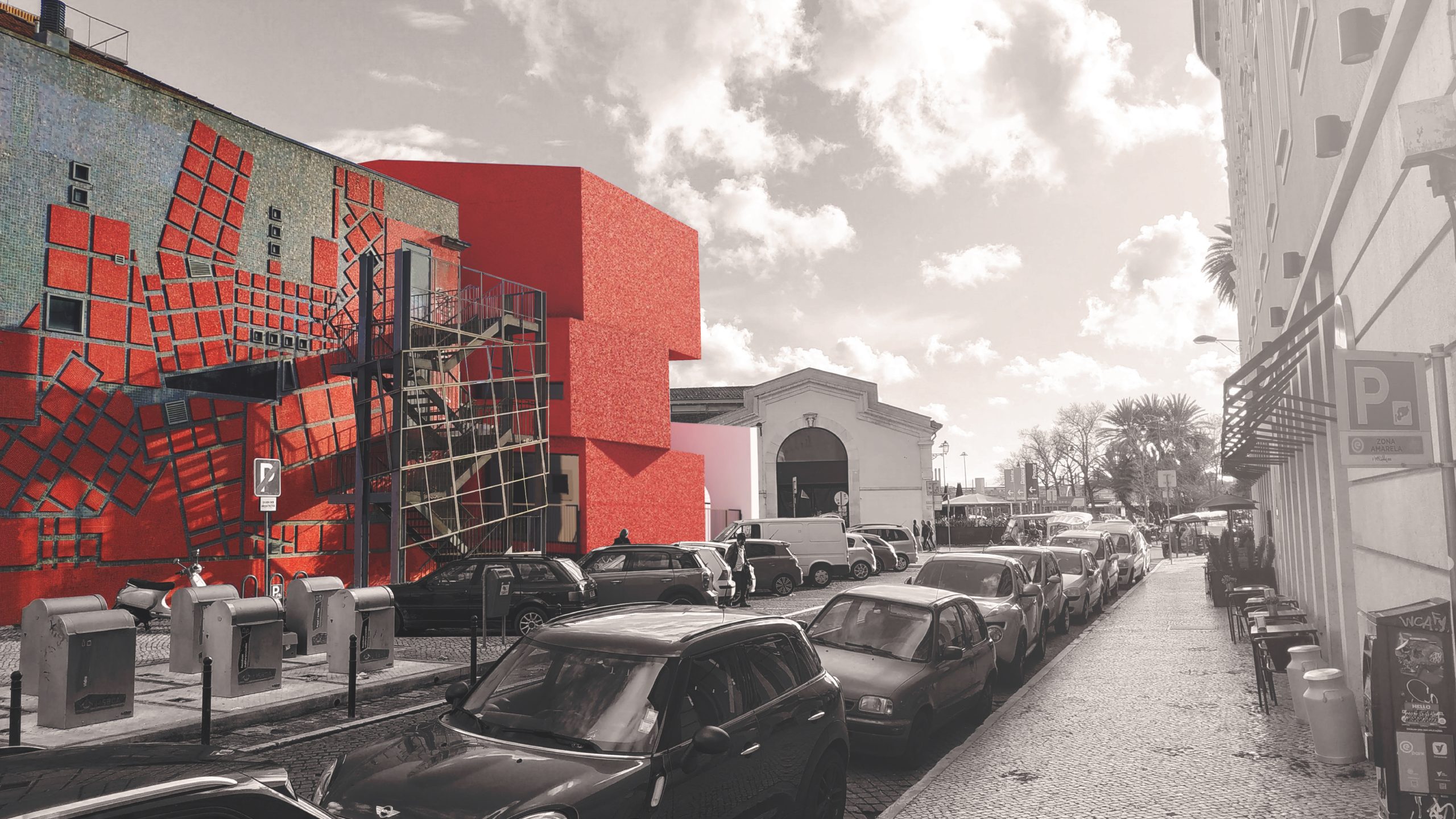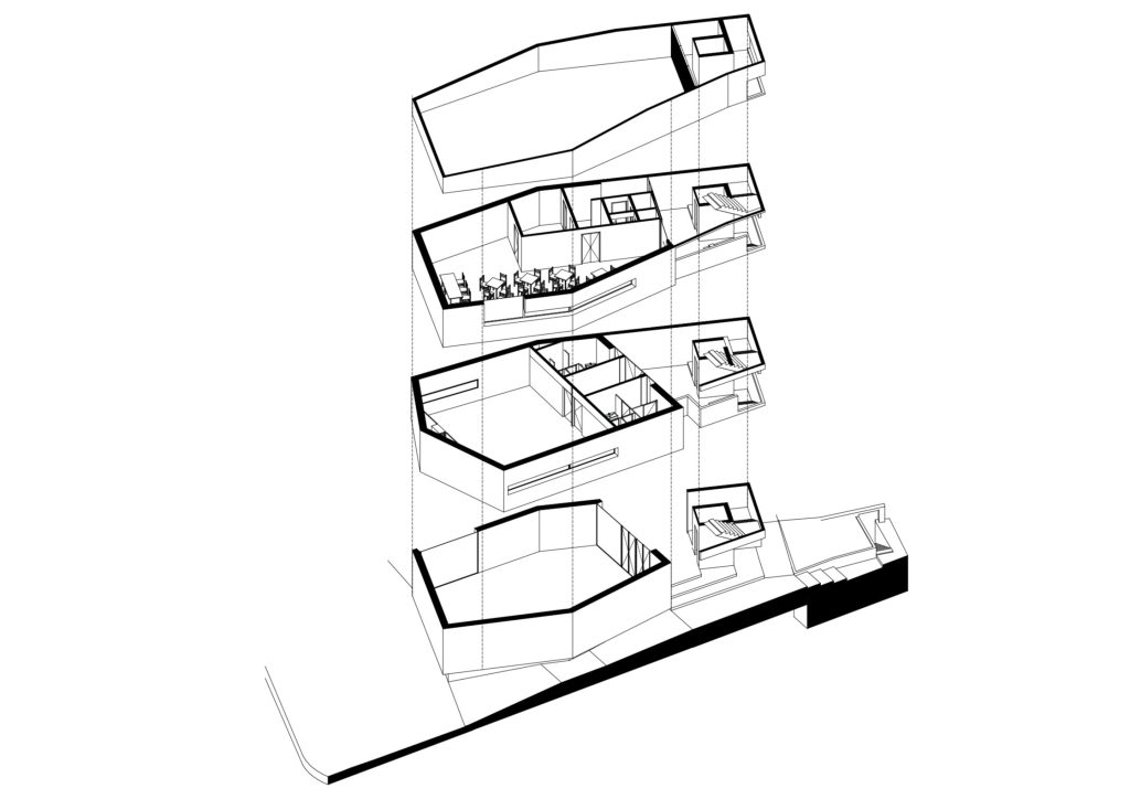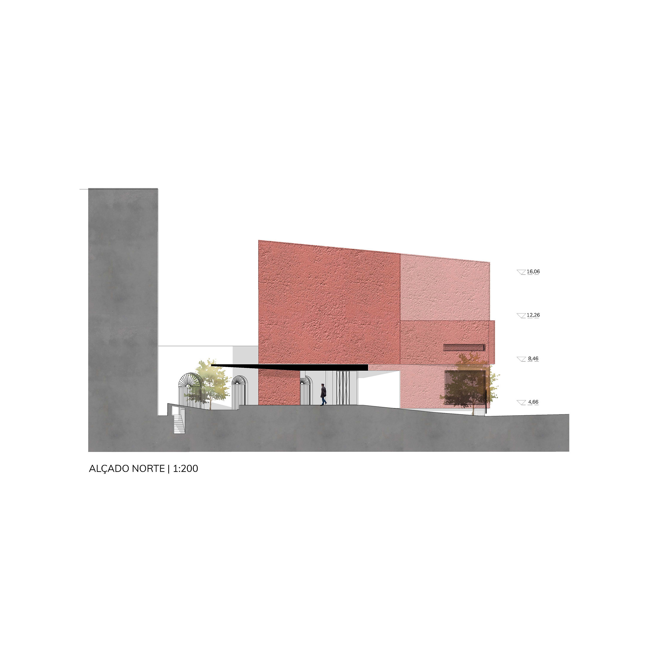 A escala vertical do edifício proposto, volume fragmentado piso a piso, dialoga com a massa horizontal da sede e dá continuidade visual à empena ao mesmo tempo que revela espaços estreitos ao modo do tecido espontâneo da Lisboa medieval em que se passa por becos e travessas.