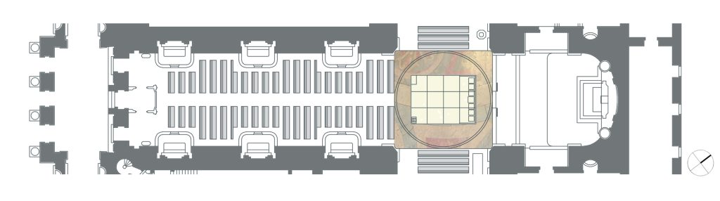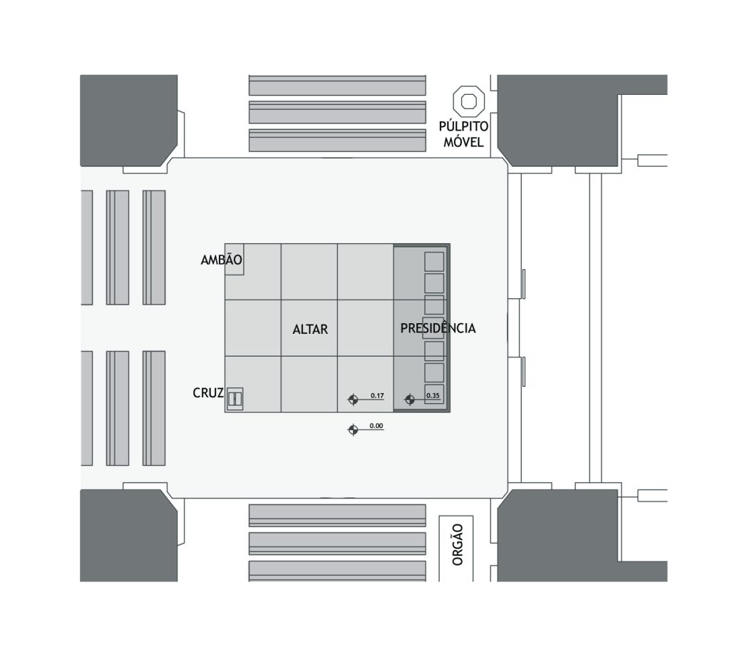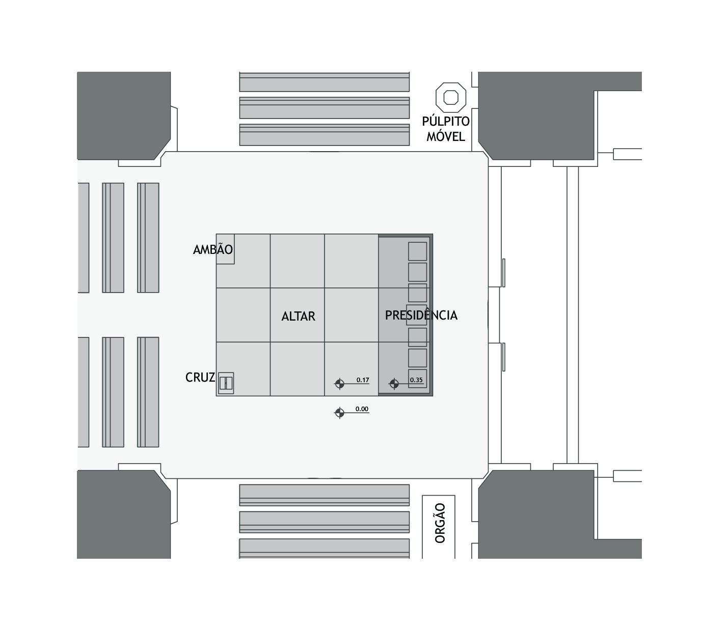 Com um desenho contemporâneo e utilizando o aço e a madeira laminada no altar, no ambão, na base da cruz processional no supedâneo para o novo presbitério, estes elementos estabelecem a diferença entre o preexistente e a proposta sem criar interferências.